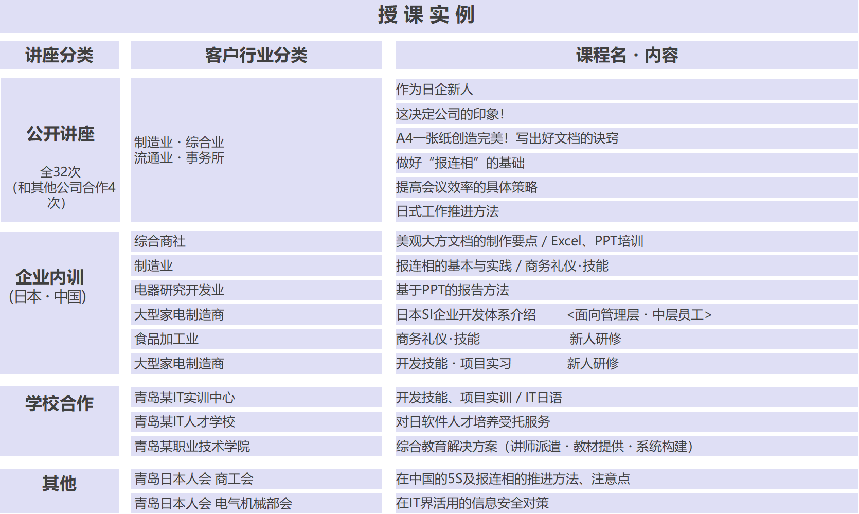 富佳通過(guò)多年的業(yè)務(wù)經(jīng)驗(yàn),我們?cè)跒楸姸嗫蛻?hù)提供人才培養(yǎng)支援服務(wù)的過(guò)程中積累了豐富的咨詢(xún)經(jīng)驗(yàn)和技能。提供面向新員工、干部員工的企業(yè)內(nèi)部培訓(xùn),我們擁有充實(shí)的課程庫(kù),可以按照顧客的需要提供最合適的課程。